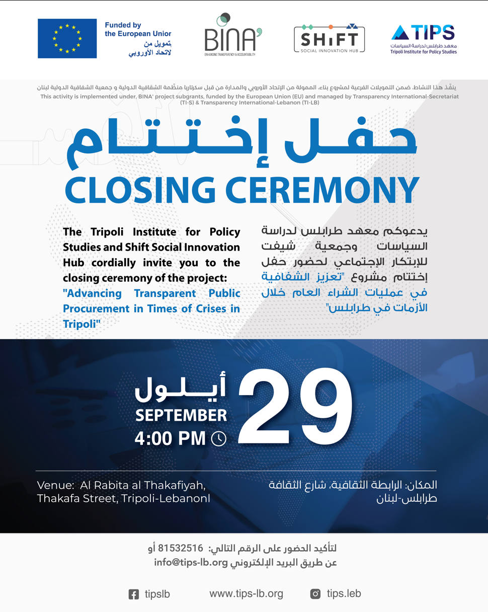 يدعوكم معهد طرابلس لدراسة السياسات وجمعية شيفت للإبتكار الإجتماعي لحضور حفل إختتام مشروع "تعزيز الشفافية في عمليات الشراء العام خلال الأزمات في طرابلس" الاثنين 29 أيلول، الساعة الرابعة في مركز الرابطة الثقافية، شارع الثقافة، طرابلس-لبنان ينفّذ هذا النشاط، ضمن التمويلات الفرعية لمشروع بناء، الممولة من الإتحاد الأوروبي والمدارة من قبل سكرتاريا منظّمة الشفافية الدولية و جمعية الشفافية الدولية لبنان __________________________________ The Tripoli Institute for Policy Studies and Shift Social Innovation Hub cordially invite you to the closing ceremony of the project: "Advancing Transparent Public Procurement in Times of Crises in Tripoli" Monday September 29th, at 4pm Venue: Al Rabita al Thakafiya, Thakafa street, Tripoli-Lebanon This activity is implemented under, BINA' project subgrants, funded by the European Union (EU) and managed by Transparency International-Secretariat (TI-S) & Transparency International-Lebanon (TI-LB)