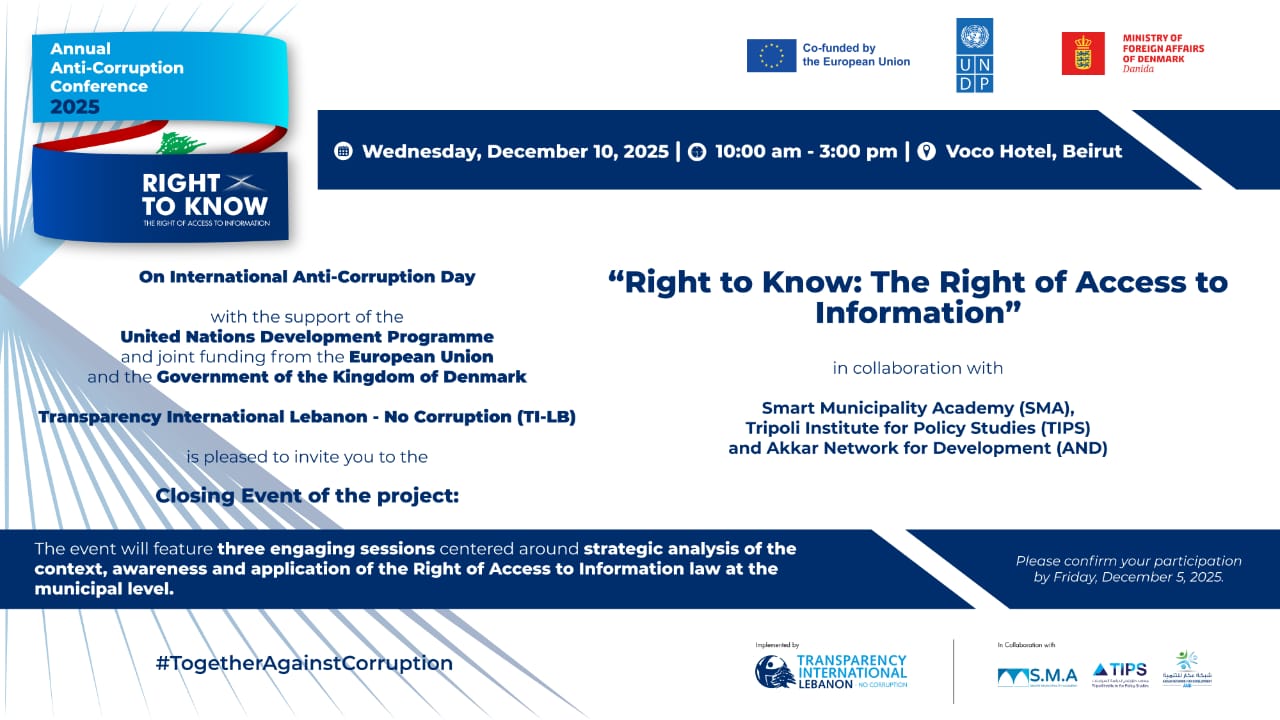 On international Anti-Corruption Day, with the support of the United Nations Development Programme and joint funding from the European Union and the Government of the Kingdom of Denmark, Transparency international Lebanon - No Corruption (TI-LB) is please to invite you to the closing Event of the project: "Right to Know: The Right of Access to Information" in collaboration with Smart Municipality Academy (SMA), Tripoli Institute for Policy Studies (TIPS) and Akkar Network for Development (AND). Wednesday, December 10, 2025 from 10am to 3pm at Voco Hotel, Beirut. #TogetherAgainstCorruption